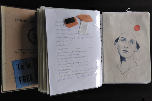 The Recipe and Sample Workbook consists of sheets of handmade paper with fiber samples, recipe logs and brief information regarding the purpose of the paper... for example: refugee papermaking workshop; order of veteran uniform paper; paper made from underwear to benefit LGBTQ organisations...