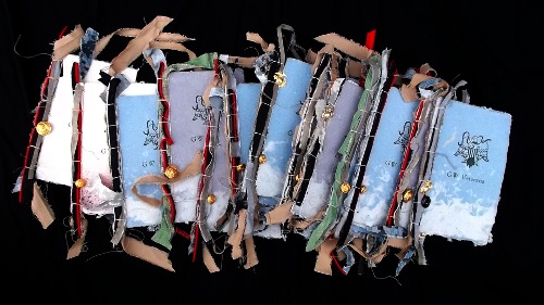 One of our traditions in working with veterans of any generation is creating a ledger for each group we reach. The pages of the ledger are made of uniforms from each branch of service, and strips of the cloth that have gone into the paper are sewn into the binding. It is an immense honor to be able share these large books with veteran organizations.