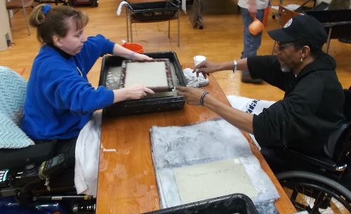 This allows veterans to begin the process by working directly with pulps to which they feel connected. Throughout the course of the workshop, new techniques of creative sheet formation are introduced and individuals become interested in combining pulps to develop unique compositions.